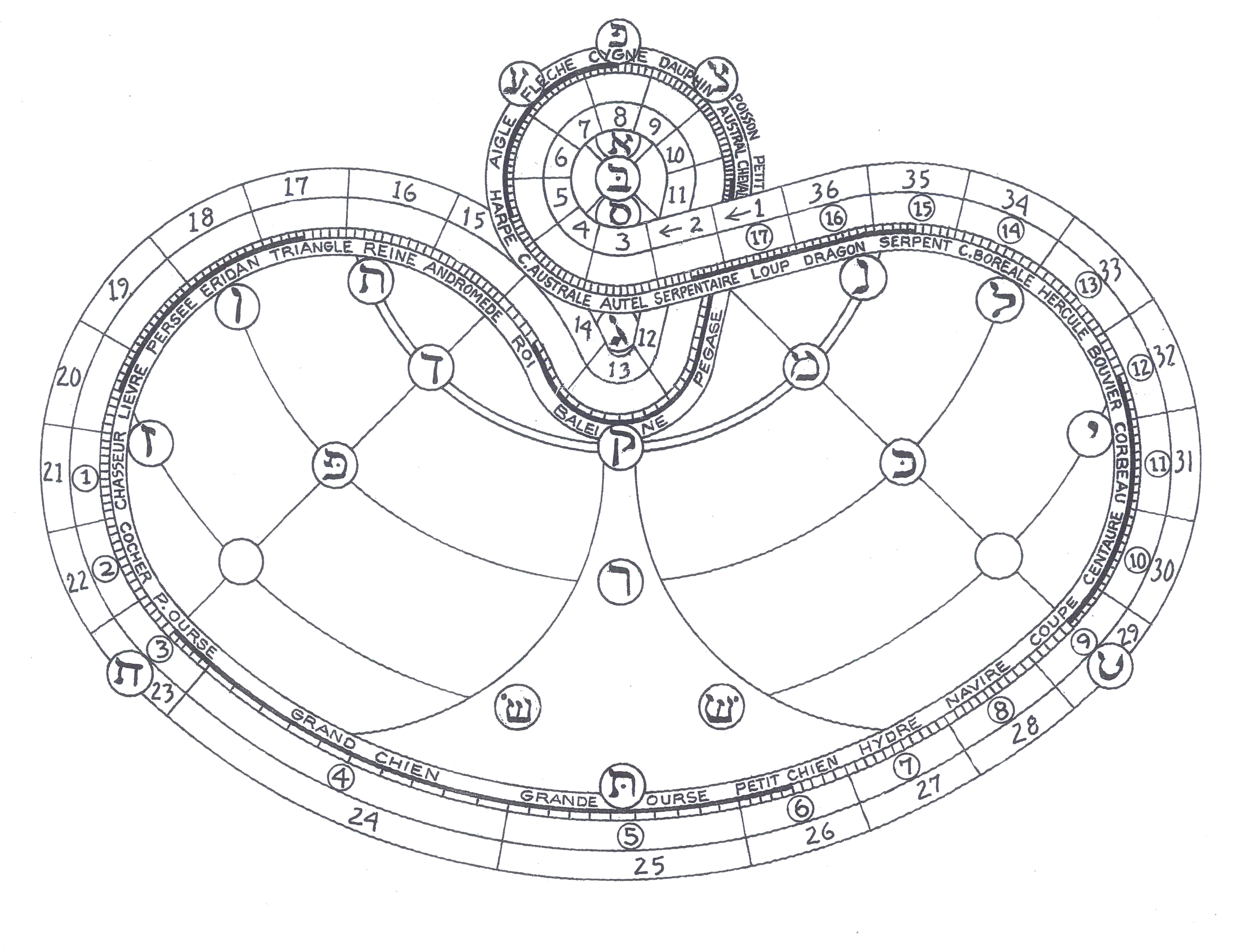 L’astrologie hébraïque étant lunaire, le positionnement des années commence sur le secteur du Chasseur – lettre heith, cancer ; demeure de la Lune en astrologie. ( voir sur l’illustration, le chiffre – 1 – encerclé ).